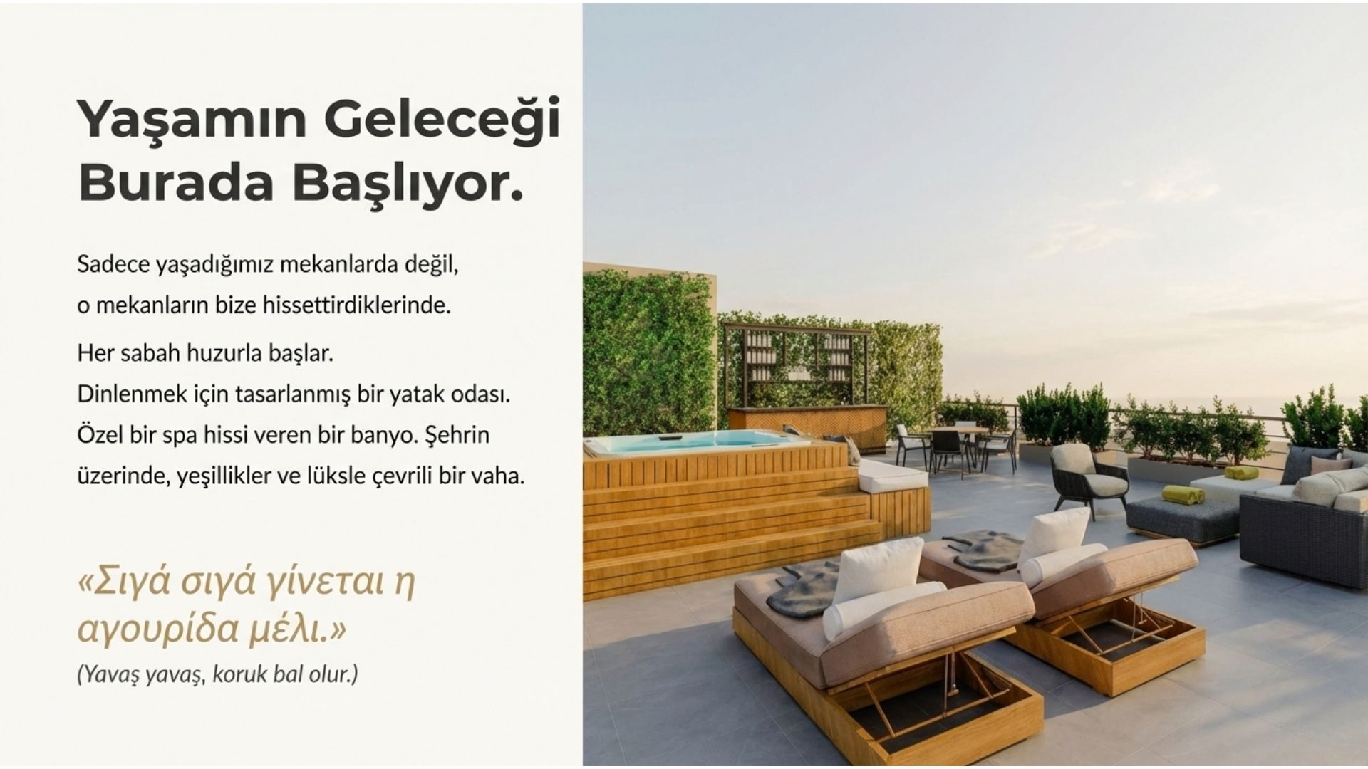 Satışa çıkan son blok yemyeşil bir sokağa bakıyor. Teras katında tam 67 m2’lik 501 numaralı daireye özel bir teras bulunuyor. Ayrıca tüm apartmanın ortak kullanımında olan ve içinde jakuzi ile mutfağın da bulunduğu bir teras bulunuyor.
